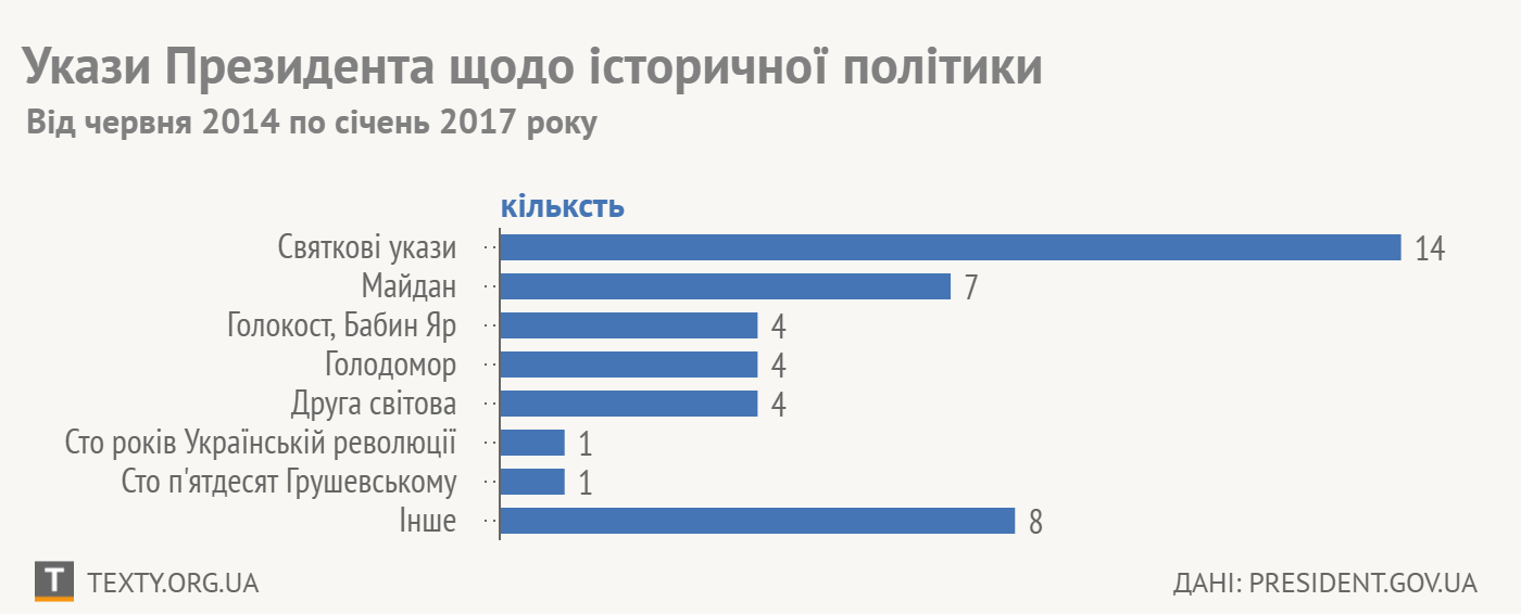 Від інаугурації Петра Порошенка до моменту, коли Ярослав Качинський висловив йому своє незадоволення, на офіційній президентській веб-сторінці з’явилося майже 1600 указів. Проте історичної політики стосуються лише 43 з них.