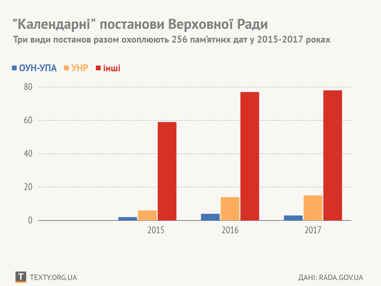 Від 2014 року замість десятків парламент випускає одну постанову «Про відзначення пам’ятних дат і ювілеїв», яка включає усі пам’ятні дати на наступний рік. Постанова на 2015 рік містила 67 пам’ятних дат, постанова на 2016 рік – 95, а цьогорічна – 94.