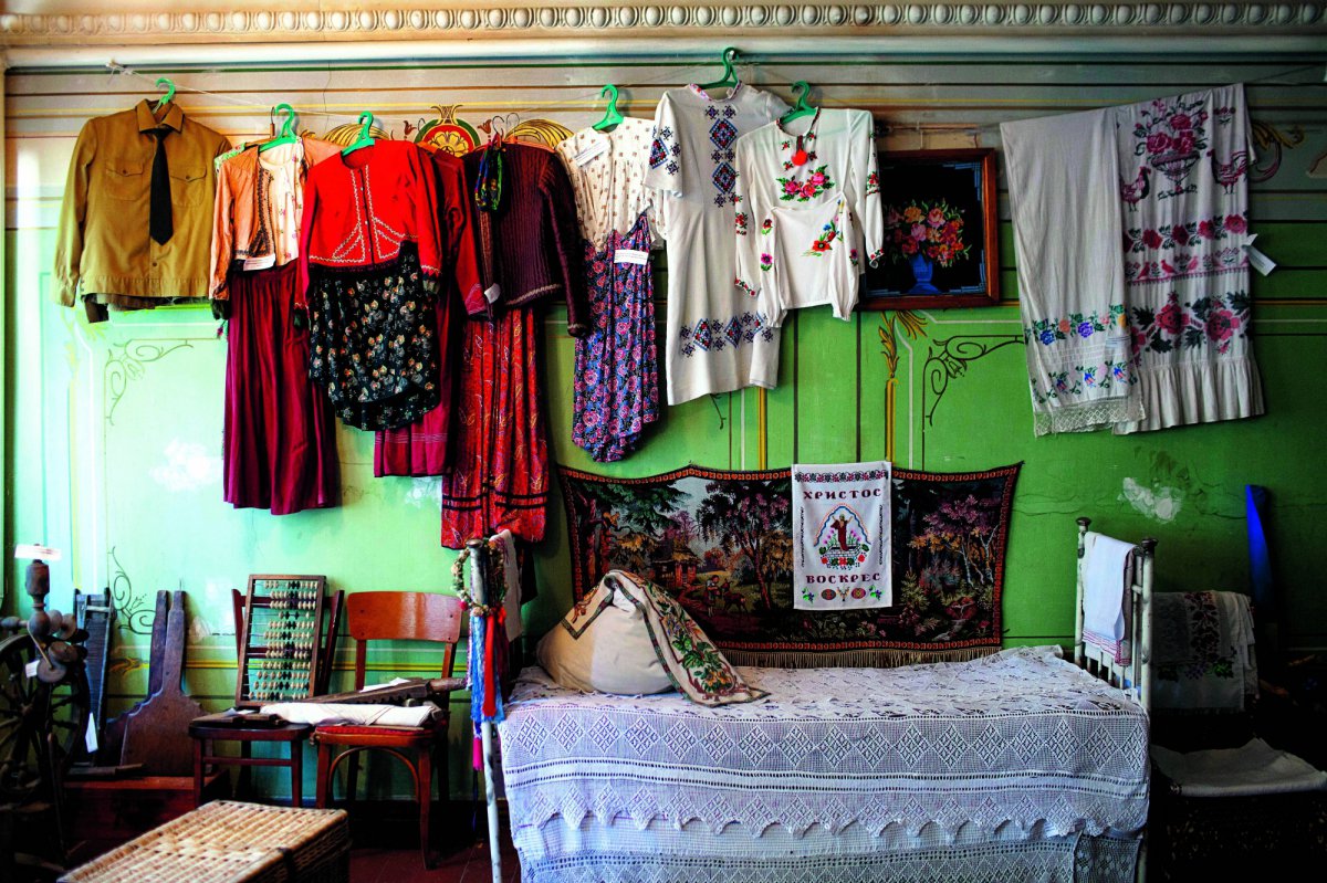 Директорка просить двох дев'ятикласниць провести мене до музею. Там виставлений традиційний одяг старовірів.
